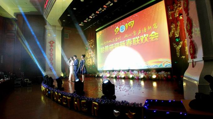 最后,公司第四黨支部王璐等演繹的新疆民族特色舞蹈《掀起你的蓋頭來(lái)》將晚會(huì)推向尾聲,所領(lǐng)導(dǎo)上臺(tái)親切慰問(wèn)全體演職人員并與大家合影留念,在《歌唱祖國(guó)》鏗鏘有力的樂(lè)曲聲中歷時(shí)近兩個(gè)小時(shí)的春節(jié)聯(lián)歡會(huì)圓滿落下帷幕。本場(chǎng)聯(lián)歡會(huì)是只屬于哈獸研人辭舊迎新的盛典,更是哈獸研人攜手共進(jìn)的盛典,2017年獸研航母將揚(yáng)帆遠(yuǎn)航,譜寫“研學(xué)產(chǎn)”輝煌的新華章!