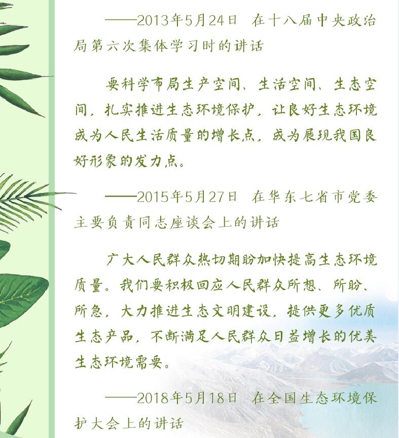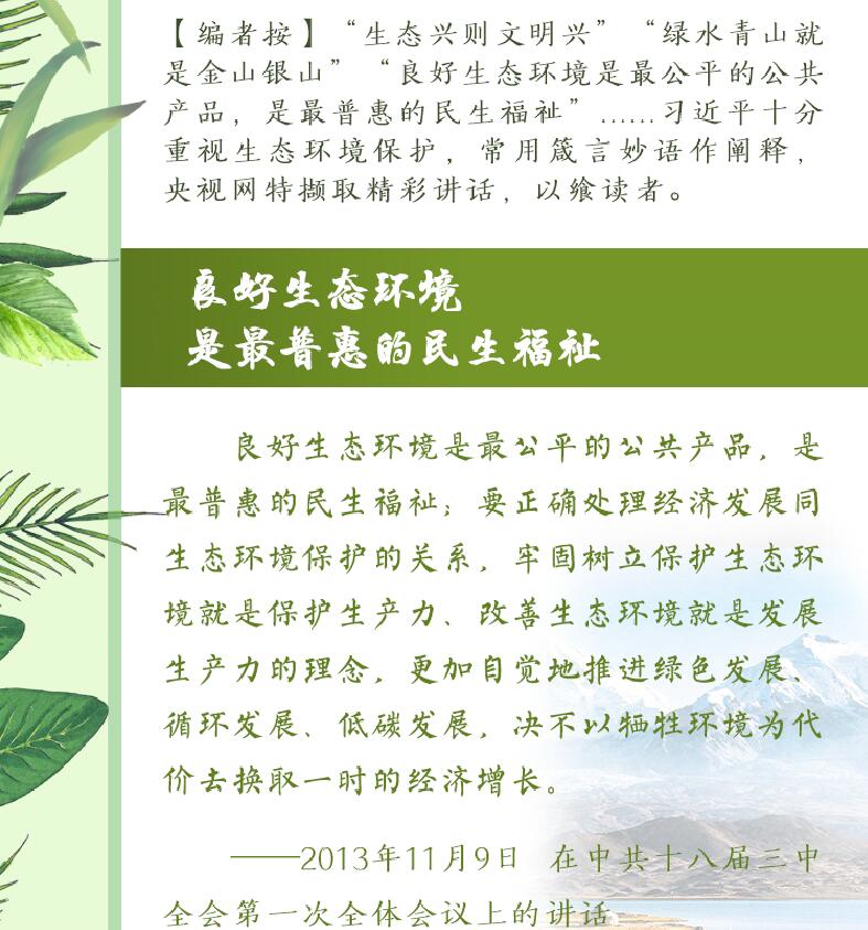 生態(tài)興則文明興,生態(tài)衰則文明衰。生態(tài)環(huán)境保護一直是習(xí)近平總書記的心中牽掛。無論是外出調(diào)研,還是參加中共中央政治局的集體學(xué)習(xí),他反復(fù)強調(diào)生態(tài)文明建設(shè)的重要性。正值世園會開幕之際,讓我們重溫總書記關(guān)于生態(tài)文明的深邃思考,去感悟豐富的生態(tài)文化。
