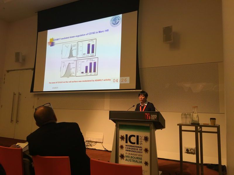 2016年8月,馮力研究員、王曉鈞研究員、王玉娥研究員赴澳大利亞墨爾本參加2016年國(guó)際免疫學(xué)學(xué)術(shù)報(bào)告會(huì),進(jìn)一步掌握世界各國(guó)對(duì)新型免疫技術(shù)、疫苗開發(fā)、微生物叢應(yīng)用及天然免疫學(xué)理論研究的進(jìn)展,為研究獸醫(yī)微生物,尤其是致病性病毒的免疫學(xué)提供思路,進(jìn)而為更合理應(yīng)用免疫學(xué)新技術(shù)防控我國(guó)重大動(dòng)物疫病的發(fā)生發(fā)展提供工具。王玉娥研究員做了題為“Regulation role of metalloprotease ADAM17 on porcine reproductive and respiratory syndrome virusinfection”的學(xué)術(shù)報(bào)告。