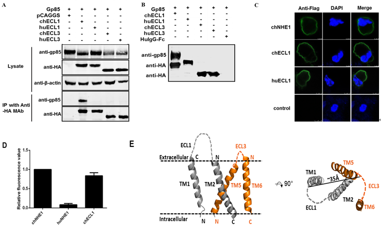 J亞群禽白血病病毒與細胞受體的結(jié)合是病毒感染宿主的第一步,這項研究發(fā)現(xiàn)J亞群禽白血病病毒與細胞受體的第一個膜外環(huán)直接結(jié)合,并首次揭示第一個膜外環(huán)上的12個氨基酸是介導(dǎo)病毒進入細胞的最小受體功能域,其與病毒囊膜蛋白結(jié)合,啟動病毒對宿主感染過程。進一步研究發(fā)現(xiàn),在病毒感染過程中,人為添加可溶性的膜外環(huán)蛋白,可以抑制病毒復(fù)制,阻止病毒感染。