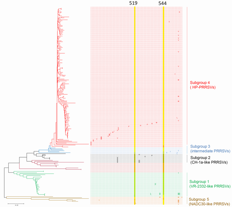 圖1. 北美型PRRSV全基因組序列進(jìn)化分析及突變氨基酸的位置