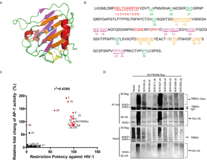 TRIM5α是恒河猴細胞中一種阻礙HIV-1感染的重要種間限制因子。TRIM5α屬于TRIM(三重結(jié)構(gòu)域)蛋白家族中的一員,具有RING,B-Box 2,coiled coil 和SPRY結(jié)構(gòu)域。TRIM5α不僅能通過結(jié)合剛進入細胞的病毒衣殼蛋白促使病毒非正常脫殼,同時可作為模式識別受體結(jié)合病毒衣殼蛋白通過TAB2、TAK1依賴的信號通路激活天然免疫,發(fā)揮抗病毒功能。已報道RING結(jié)構(gòu)域的E3泛素連接酶活性對于TRIM5α激活的信號通路至關(guān)重要,然而SPRY除了與病毒衣殼蛋白結(jié)合以外是否參與TRIM5α天然免疫調(diào)節(jié)以及調(diào)控機制未見報道。