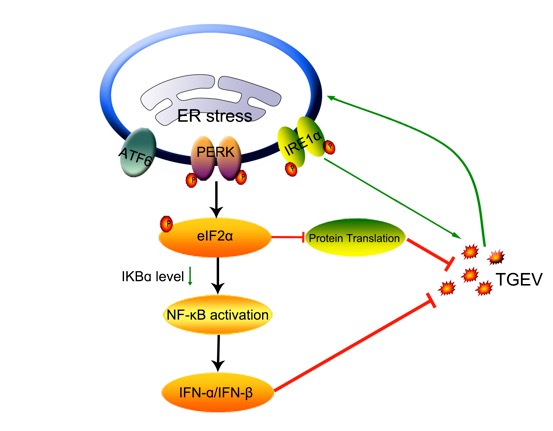 內質網作為蛋白質折疊和翻譯后修飾的重要場所,是病毒復制和成熟的必需細胞器。病毒感染后,細胞內合成大量的病毒蛋白,從而增加內質網的負擔,進而增加了未折疊蛋白和錯誤折疊蛋白的堆積。因此,病毒感染后通常會誘發(fā)內質網應激。但是,對于內質網應激如何調控冠狀病毒的復制及其調控機制目前還不明確。在劉平黃研究員的指導下,該團隊薛美博士發(fā)現(xiàn)TGEV感染在體內和體外均能誘導內質網應激,激活未折疊蛋白反應,進一步研究發(fā)現(xiàn)TGEV誘導的內質網應激負調控病毒復制。盡管TGEV感染能夠不同程度的激活PERK、ATF6和IRE1三個信號通路,利用RNA干擾和特異性抑制劑處理發(fā)現(xiàn)僅PERK通路發(fā)揮抑制TGEV復制的功能。其分子機制是PERK通路激活導致eIF2α磷酸化,磷酸化的eIF2α通過抑制蛋白翻譯抑制TGEV復制;除了對病毒復制直接的抑制作用,PERK-eIF2α通路還激活NF-κB,促進I型干擾素產生,從而抑制TGEV復制。該研究表明內質網應激的PERK-eIF2α通路在調節(jié)天然免疫和冠狀病毒復制方面發(fā)揮重要作用。