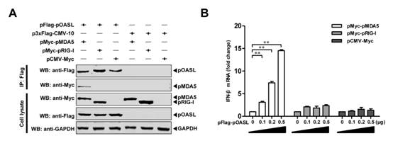 圖注:OASL蛋白與MDA5相互作用并增強(qiáng)MDA5介導(dǎo)的I型干擾素信號(hào)通路