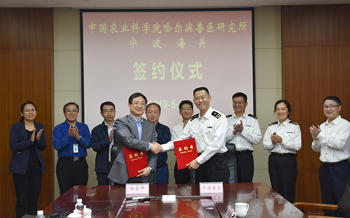 步志高所長(zhǎng)向董超副關(guān)長(zhǎng)表示了歡迎,董超副關(guān)長(zhǎng)表示通過參觀研究所所區(qū)及實(shí)驗(yàn)室區(qū)域,對(duì)哈獸研的基礎(chǔ)建設(shè)、人才建設(shè)、管理及文化留下了深刻印象。座談中,雙方就如何合作申請(qǐng)科研項(xiàng)目,推動(dòng)合作研究,以及非洲豬瘟防控形勢(shì)和口岸防控等相關(guān)內(nèi)容進(jìn)行了深入細(xì)致的討論。最后,雙方簽署了合作諒解備忘錄,聯(lián)合共建“中國(guó)農(nóng)業(yè)科學(xué)院哈爾濱獸醫(yī)研究所—寧波動(dòng)物檢疫合作實(shí)驗(yàn)室”,并承諾在此合作平臺(tái)基礎(chǔ)上加強(qiáng)聯(lián)系,深入開展實(shí)質(zhì)性合作。(文/張晶 攝影/王宇)