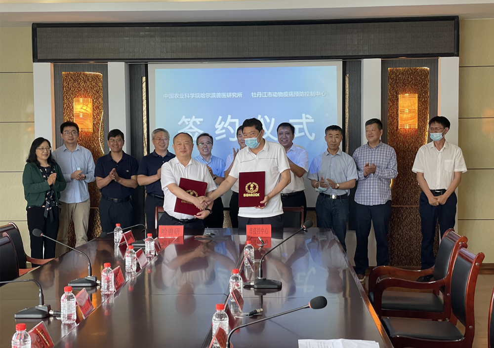 牡丹江市農(nóng)業(yè)農(nóng)村局、動物疫病預(yù)防控制中心、黑龍江笨笨樂農(nóng)牧科技發(fā)展有限公司相關(guān)領(lǐng)導,哈獸研有關(guān)專家和部門負責人參加簽約揭牌儀式。