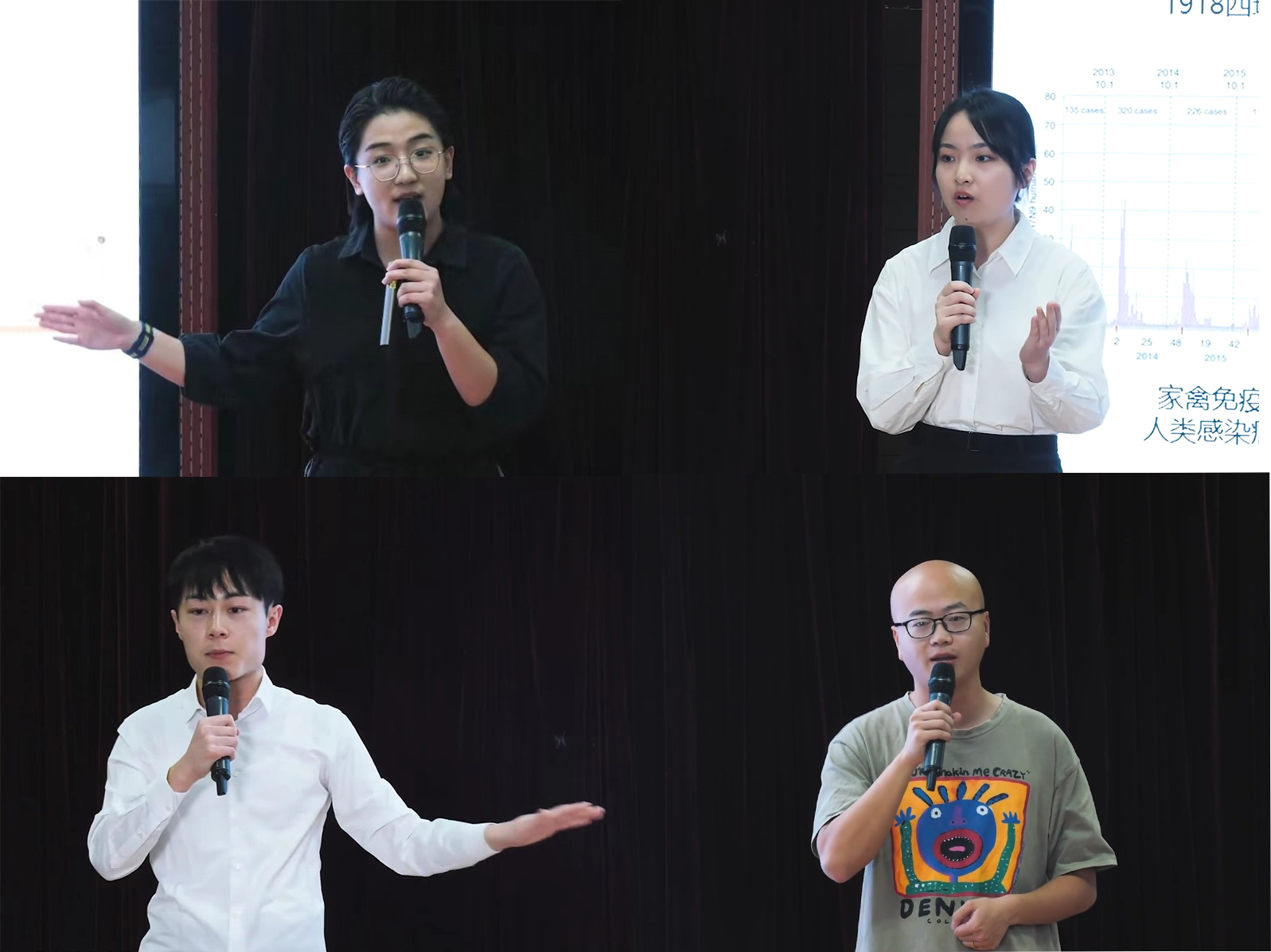 經(jīng)研究所初賽,我所動物流感基礎(chǔ)與防控研究創(chuàng)新團(tuán)隊(duì)的王一晗、于晴晴、王逸凡,以及豬消化道傳染病創(chuàng)新團(tuán)隊(duì)的朱曉遠(yuǎn)等4位同學(xué)入圍決賽。他們分別以《流感與達(dá)菲》《與幽靈共舞》《Membrane Fusion》和《豬流行性腹瀉冠狀病毒的自述》為題,用幽默詼諧的語言揭示枯燥的理論知識,用深入淺出的表達(dá)闡明復(fù)雜的學(xué)術(shù)問題。最終,經(jīng)過專家評委打分與大眾評審?fù)镀保鞎赃h(yuǎn)榮獲決賽二等獎,王一晗和于晴晴榮獲決賽三等獎,王逸凡榮獲決賽優(yōu)秀獎。