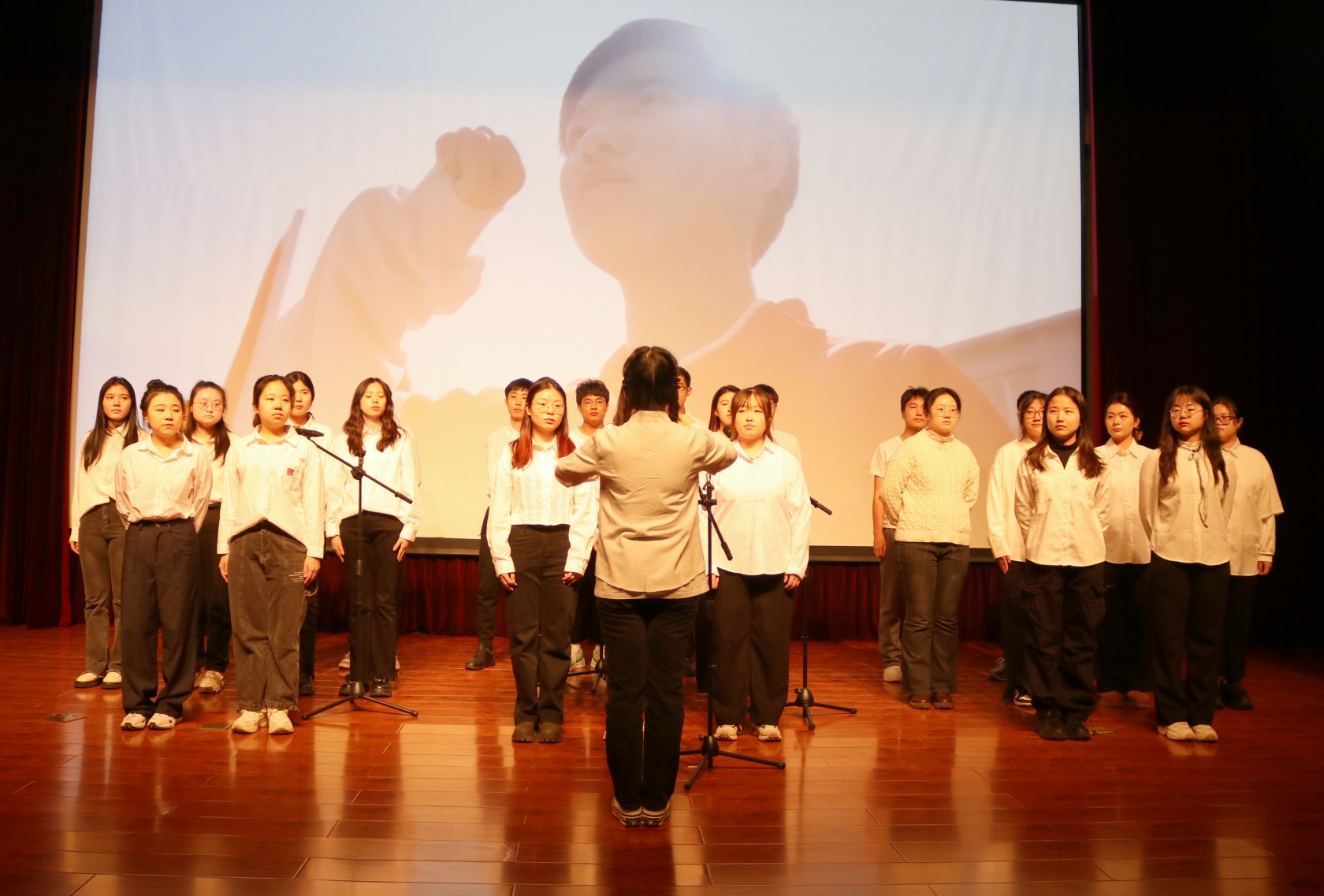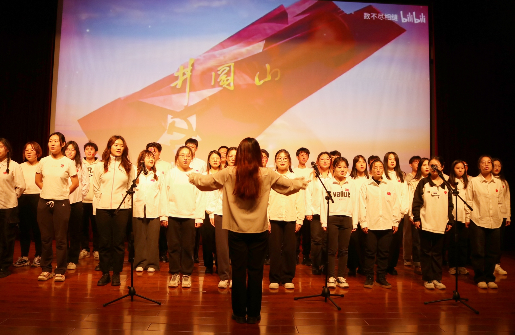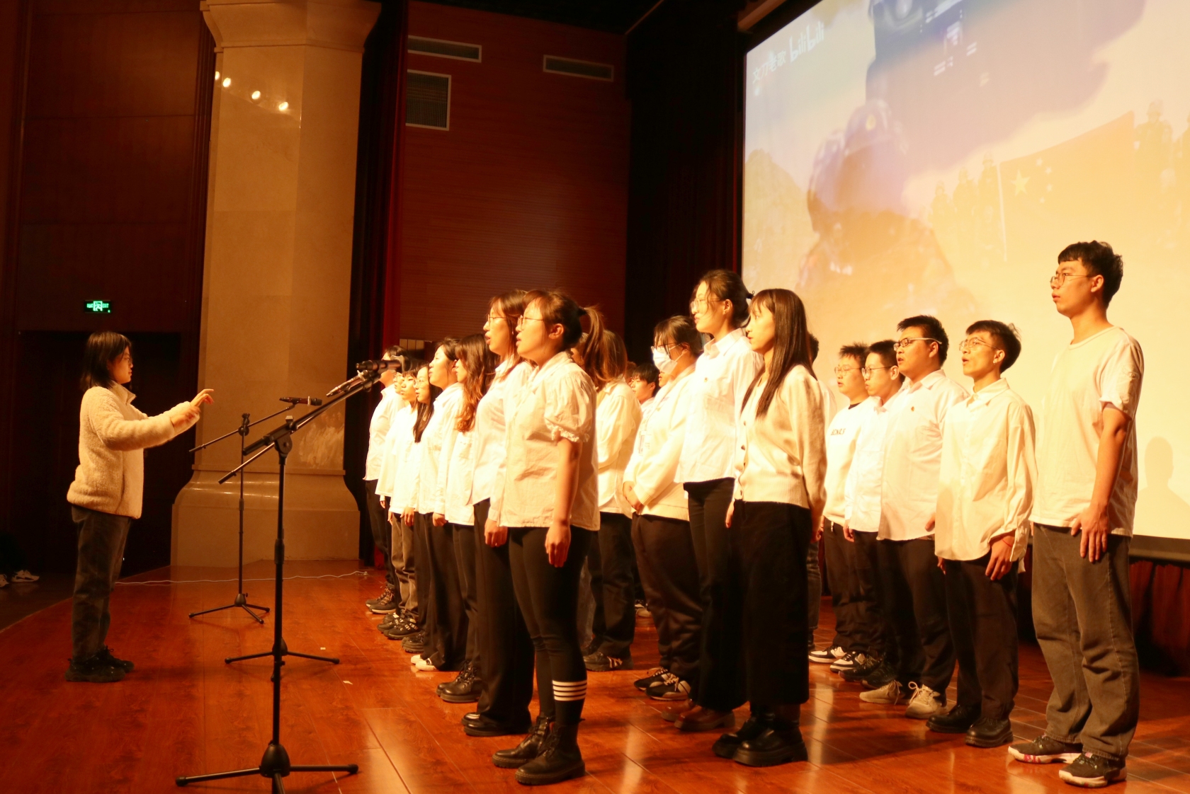 本次活動在“一二·九”學(xué)生愛國救亡運動紀(jì)錄短片中拉開序幕。當(dāng)鏗鏘有力的音樂在報告廳響起,熱情激蕩的旋律縈繞耳畔,劃破黑暗舞動的音符仿佛帶我們走進那戰(zhàn)火紛飛、熱血激情的紅色年代。聆聽著一曲曲動人心弦的愛國歌聲,感受著一陣陣直擊內(nèi)心的愛國熱情,燃起了當(dāng)代學(xué)子與祖國和時代共前行的無限希望?!稕]有共產(chǎn)黨就沒有新中國》《歌唱祖國》《我和我的祖國》歌頌黨和無數(shù)中華兒女刻骨銘心永恒不變的殷殷愛國情;《少年中國說》《中國共青團團歌》唱出了新時代青年血脈傳承矢志不渝的拳拳報國志;2023級碩士黨支部帶來舞臺劇《百年傳承》,生動形象演繹了崢嶸歲月共產(chǎn)黨人堅貞無畏的英勇氣概,現(xiàn)場爆發(fā)陣陣掌聲掀起了活動的新高潮。