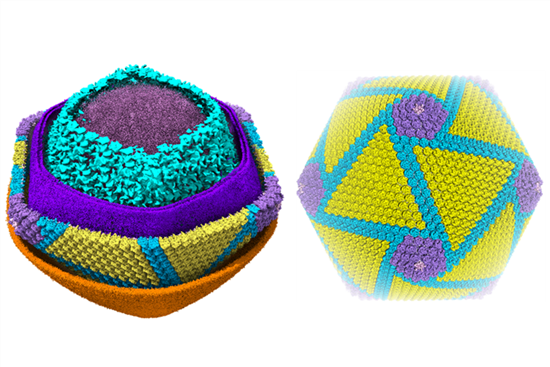 非洲豬瘟病毒整體結(jié)構(gòu)(左:5層切面圖;右:衣殼層整體結(jié)構(gòu))。研究團(tuán)隊(duì) 供圖