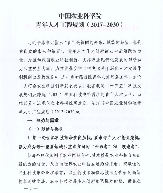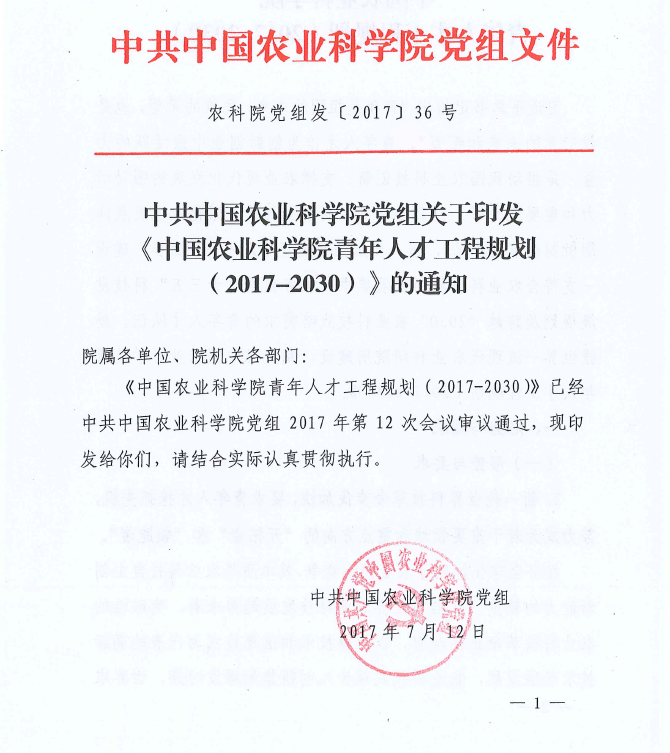 中共中國(guó)農(nóng)業(yè)科學(xué)院黨組關(guān)于印發(fā)《中國(guó)農(nóng)業(yè)科學(xué)院青年人才工程規(guī)劃(2017-2030)》的通知