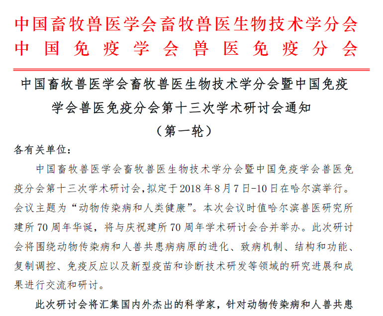 中國畜牧獸醫(yī)學(xué)會(huì)畜牧獸醫(yī)生物技術(shù)學(xué)分會(huì)暨中國免疫學(xué)會(huì)獸醫(yī)免疫分會(huì)第十三次學(xué)術(shù)研討會(huì)通知