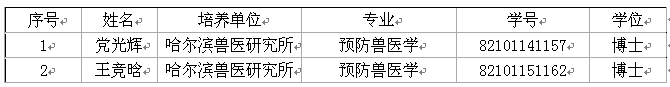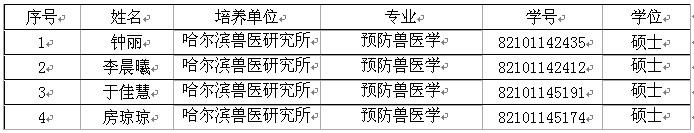 根據(jù)《中國農(nóng)業(yè)科學(xué)院研究生院研究生國家獎(jiǎng)學(xué)金評(píng)審辦法(試行)》的有關(guān)規(guī)定,經(jīng)過個(gè)人申報(bào)、導(dǎo)師推薦、研究所初審、學(xué)位委員會(huì)評(píng)定,哈爾濱獸醫(yī)研究所現(xiàn)推薦黨光輝等2名博士研究生、鐘麗等4名碩士研究生為2016年度國家獎(jiǎng)學(xué)金獲獎(jiǎng)候選人(具體名單附后)。為了保證此項(xiàng)工作的公開、公平、公正,現(xiàn)將名單進(jìn)行公示(公示時(shí)間截至2016年11月15日)。