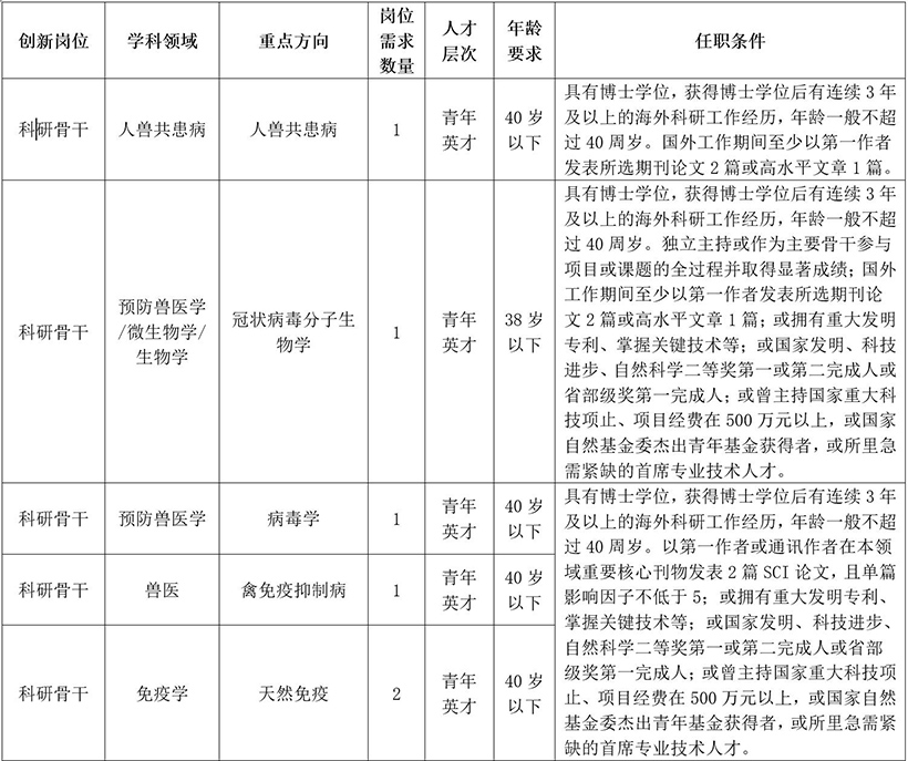 根據(jù)《中國(guó)農(nóng)業(yè)科學(xué)院農(nóng)科英才特殊支持管理辦法》和《中國(guó)農(nóng)業(yè)科學(xué)院“青年英才計(jì)劃”管理辦法》相關(guān)文件要求,經(jīng)中國(guó)農(nóng)業(yè)科學(xué)院批準(zhǔn),哈爾濱獸醫(yī)研究所現(xiàn)面向海內(nèi)外招聘農(nóng)科英才,現(xiàn)就有關(guān)事項(xiàng)公告如下: