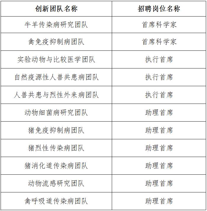 根據(jù)院、所人才規(guī)劃,為加強(qiáng)我所科技創(chuàng)新團(tuán)隊(duì)建設(shè),吸引具有國(guó)際視野和高水平的青年學(xué)科帶頭人和創(chuàng)新人才,進(jìn)一步提高科技創(chuàng)新能力、國(guó)際競(jìng)爭(zhēng)力和學(xué)術(shù)引領(lǐng)能力,2020年中國(guó)農(nóng)業(yè)科學(xué)院哈爾濱獸醫(yī)研究所面向全球公開(kāi)招聘創(chuàng)新團(tuán)隊(duì)首席科學(xué)家、執(zhí)行首席、助理首席,現(xiàn)將有關(guān)事項(xiàng)公告如下: