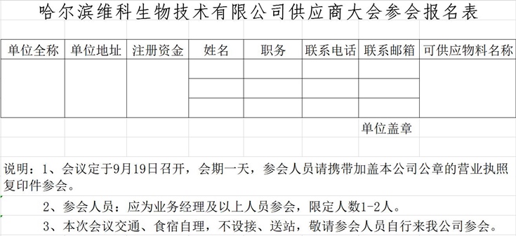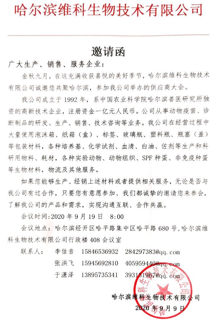 金秋九月,在這充滿收獲喜悅的美好季節(jié),哈爾濱維科生物技術(shù)有限公司誠(chéng)邀您共聚哈爾濱,參加哈獸維科供應(yīng)商大會(huì)。