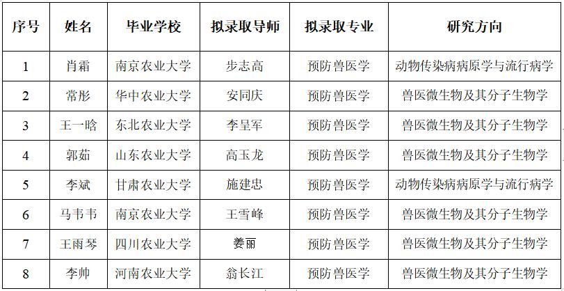中國農(nóng)業(yè)科學(xué)院哈爾濱獸醫(yī)研究所2021年擬錄取推薦免試研究生名單