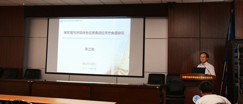 李海圍繞“Nido病毒與巨噬細(xì)胞”這一主題,介紹了不同人畜Nido病毒與宿主巨噬細(xì)胞互作的研究進(jìn)展,深入地闡述了Nido病毒的特點(diǎn)、危害以及Nido病毒共性機(jī)制研究的必要性等問(wèn)題。隨后,李海分享了所內(nèi)青年科研工作者在承擔(dān)重點(diǎn)實(shí)驗(yàn)室自主研究課題跨團(tuán)隊(duì)合作、協(xié)同攻關(guān)的重要性和科學(xué)意義。李海研究員2014年入選中國(guó)農(nóng)業(yè)科學(xué)院“青年英才計(jì)劃”A類(lèi)計(jì)劃。目前,他主持2018年重點(diǎn)實(shí)驗(yàn)室自主課題“Nido病毒感染共性機(jī)制研究”項(xiàng)目。