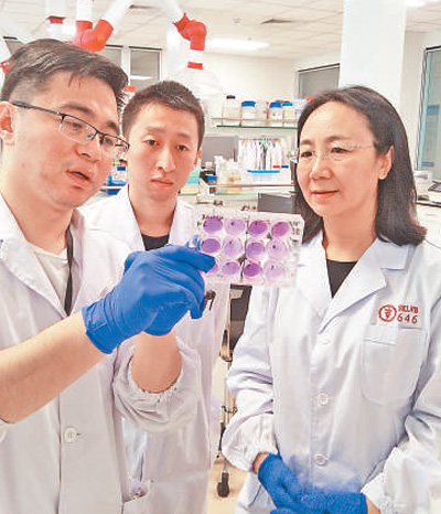 陳化蘭(右一)正在與學(xué)生一起查看實驗結(jié)果。