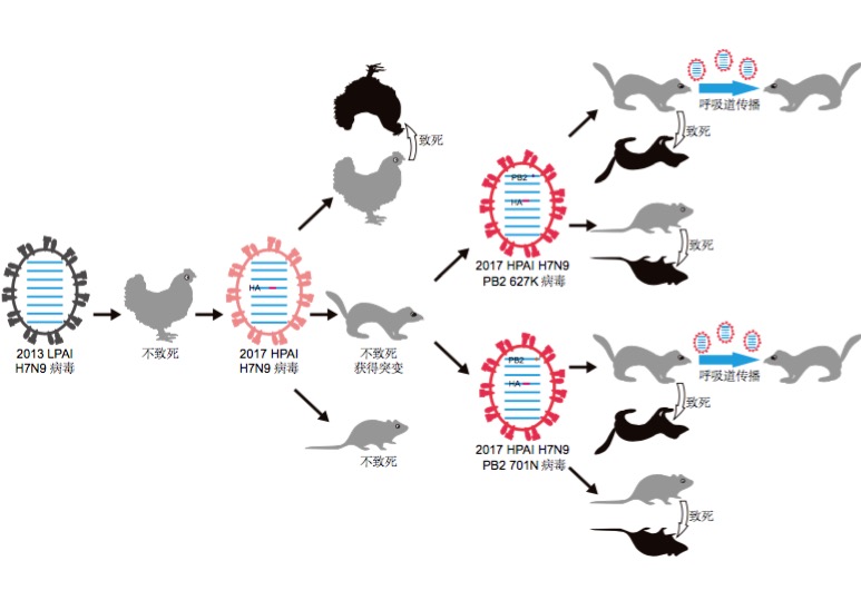 2013年7月至2017年1月期間,中國(guó)農(nóng)業(yè)科學(xué)院哈爾濱獸醫(yī)研究所國(guó)家禽流感參考實(shí)驗(yàn)室從二十多個(gè)省的活禽市場(chǎng)、家禽養(yǎng)殖場(chǎng)和屠宰場(chǎng)共采集11萬(wàn)多份樣品,分離到293株H7N9流感病毒?;蚪M解析發(fā)現(xiàn)這些病毒頻繁重組,共形成23種不同基因型,90%以上的毒株具有對(duì)人易感的分子特點(diǎn)。重要的是,今年1月在廣東分離的7株病毒在血凝素基因裂解位點(diǎn)發(fā)生變異。動(dòng)物實(shí)驗(yàn)發(fā)現(xiàn),這類變異株對(duì)雞具有高致死性,對(duì)小鼠和雪貂無(wú)致病力,但在雪貂體內(nèi)復(fù)制一代后即可獲得適應(yīng)哺乳動(dòng)物關(guān)鍵突變,突變后的毒株對(duì)小鼠的致病力增加萬(wàn)倍以上,可引起雪貂嚴(yán)重發(fā)病、死亡,并在雪貂之間經(jīng)呼吸道飛沫傳播。值得擔(dān)憂的是,H7N9病毒在人體內(nèi)復(fù)制時(shí)極易獲得這種突變。相關(guān)研究于10月24日在國(guó)際著名學(xué)術(shù)期刊《Cell Research》在線發(fā)表。施建忠副研究員等6人為共同第一作者,陳化蘭研究員為通訊作者。
