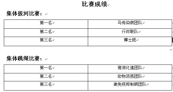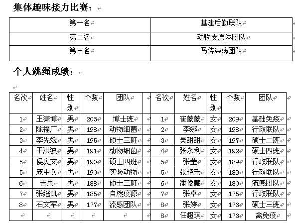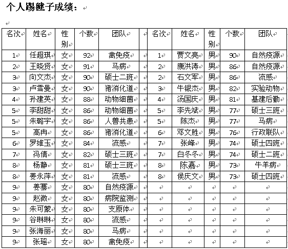 經(jīng)過激烈角逐,馬傳染病團(tuán)隊在拔河比賽中折的桂冠,豬消化道團(tuán)隊在集體跳繩項目中拔得頭籌,集體趣味接力比賽的冠軍被基建后勤聯(lián)隊收入囊中。個人項目中博士班王瀟博同學(xué)以每分鐘203次的跳繩記錄、禽免疫抑制病團(tuán)隊的任超琪以每分鐘92次的踢毽子記錄獲得單項比賽的第一名。