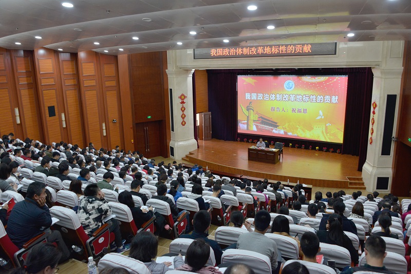 祝福恩教授從十九大報告入手,結(jié)合十九屆二中全會、三中全會的決策部署,深入淺出地解讀了進行黨和國家機構(gòu)改革的迫切性和必要性。他強調(diào)指出,此次改革是我黨依法治國的新實踐、新高度和新突破,具有重要的里程碑意義。祝福恩教授幽默風趣的語言和深厚的政治理論水平讓整場報告會嚴肅又不失活潑,深深吸引了在場的300余名黨員干部。
