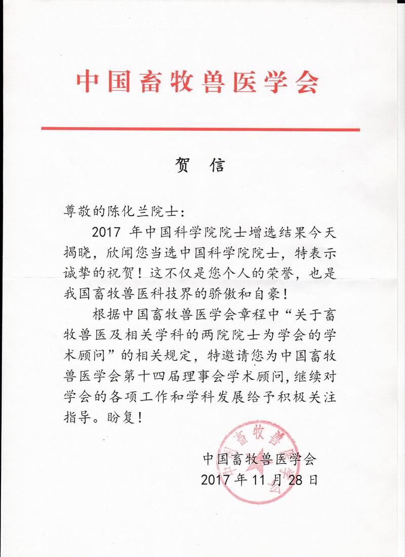 中國畜牧獸醫(yī)學(xué)會祝賀陳化蘭當(dāng)選中國科學(xué)院院士