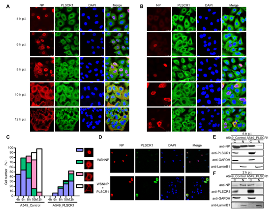 該實(shí)驗(yàn)室博士生羅維玉和碩士生張杰在李呈軍研究員、姜麗副研究員和陳化蘭院士的指導(dǎo)下,篩選到與流感病毒NP蛋白直接互作的宿主蛋白磷脂爬行酶1(PLSCR1),發(fā)現(xiàn)PLSCR1通過(guò)與NP蛋白結(jié)合抑制NP和病毒核糖核蛋白復(fù)合體(vRNP)進(jìn)入細(xì)胞核,延緩病毒整個(gè)復(fù)制周期,進(jìn)而顯著抑制流感病毒的增殖。進(jìn)一步研究發(fā)現(xiàn),PLSCR1、NP以及輸入蛋白α(Importin α)三者之間形成三聚體,阻礙細(xì)胞核輸入通路關(guān)鍵因子輸入蛋白β(Importin β)與Importin α的結(jié)合,阻止流感病毒NP和vRNP復(fù)合體通過(guò)主動(dòng)輸入途徑進(jìn)入細(xì)胞核,從而抑制流感病毒復(fù)制。