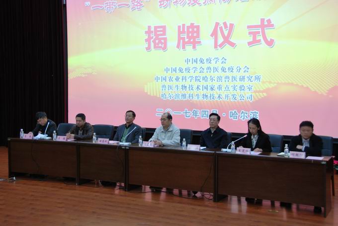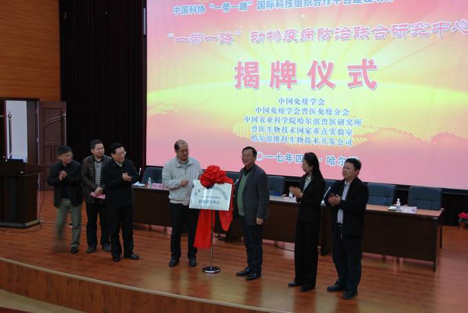 4月11日,“一帶一路”動物疫病防治聯(lián)合研究中心揭牌儀式在哈爾濱獸醫(yī)研究所隆重舉行。中國科協(xié)國際部副部長王慶林、黑龍江省科協(xié)副主席劉福、黑龍江省科協(xié)學會部部長呂強,中國免疫學會理事長田志剛、中國免疫學會常務副秘書長高揚,獸醫(yī)免疫學分會主任委員王笑梅、哈爾濱維科生物科技開發(fā)公司董事長付朝陽和100多位專家、學者參加了揭牌儀式。