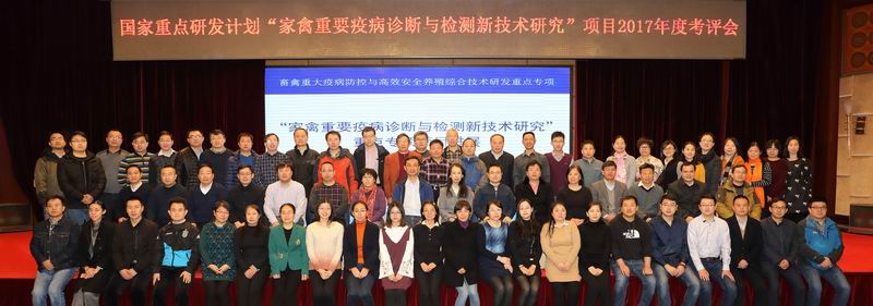 近日,十三五國家重點研發(fā)計劃項目“家禽重要疫病診斷與檢測新技術(shù)研究”2017年度考評會在北京金泰海博大酒店順利召開,本次會議由中國農(nóng)業(yè)科學(xué)院哈爾濱獸醫(yī)研究所主辦,北京農(nóng)林科學(xué)院畜牧獸醫(yī)研究所、中國農(nóng)業(yè)大學(xué)承辦??萍疾哭r(nóng)村中心葛毅強處長、項目專員孫康泰博士、魏戰(zhàn)勇博士,項目咨詢專家組王笑梅研究員、李慧姣研究員、蔣桃珍研究員、劉勝旺研究員、高玉龍研究員,課題骨干及科研助理等130余名科研人員參加了考評會。開幕式由項目首席王云峰研究員主持。