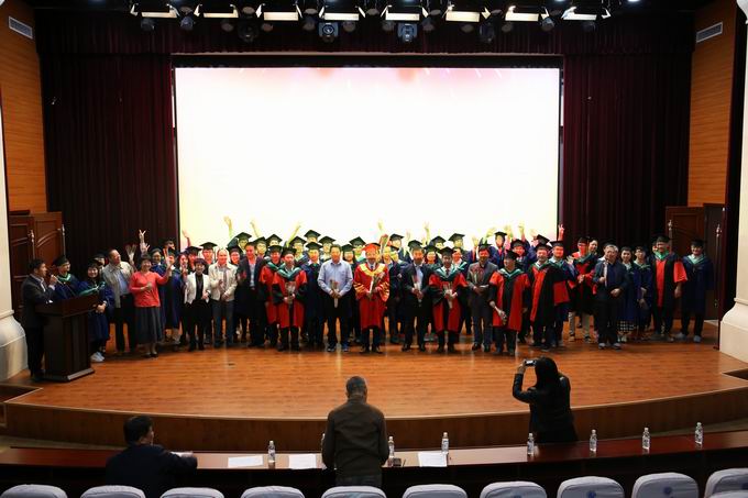 在歡快的樂曲中,59名畢業(yè)生依次踏上主席臺(tái),接受師長的扶正流蘇,宣告大家正式從研究所畢業(yè)。
