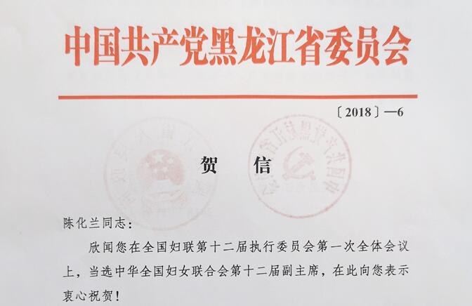 日前,中共黑龍江省委、黑龍江省人民政府給陳化蘭院士發(fā)來賀信,祝賀她當(dāng)選全國婦聯(lián)副主席。