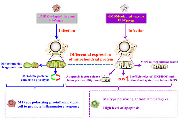 王曉鈞團(tuán)隊(duì)利用比較蛋白質(zhì)組的方法剖析具體機(jī)制,發(fā)現(xiàn)EIAV強(qiáng)弱毒感染其靶細(xì)胞-巨噬細(xì)胞后,總計(jì)有447個(gè)細(xì)胞蛋白發(fā)生差異表達(dá),其中包括73個(gè)線粒體相關(guān)蛋白,是所有細(xì)胞器中發(fā)生蛋白質(zhì)差異表達(dá)最多的。已知線粒體可通過(guò)改變代謝模式而影響巨噬細(xì)胞的極化改變(促炎或抑炎),以及降低膜通透性引起細(xì)胞凋亡。因此,該團(tuán)隊(duì)集中研究了這73個(gè)線粒體相關(guān)蛋白及其功能。首先,通過(guò)生物信息學(xué)分析發(fā)現(xiàn),這73個(gè)蛋白質(zhì)的生物學(xué)功能主要集中在三羧酸循環(huán),氧化還原,ATP合成,NADH脫氫以及氧化磷酸化等。其次,進(jìn)一步的功能驗(yàn)證實(shí)驗(yàn)表明,在線粒體相關(guān)蛋白表達(dá)水平發(fā)生改變后:1.EIAV弱毒感染細(xì)胞的NADH脫氫,氧化磷酸化和ATP生成都受到了抑制,同時(shí),由于低效的氧化磷酸化和抗氧化系統(tǒng)的破壞,導(dǎo)致活性氧的生成過(guò)量;2. EIAV弱毒感染細(xì)胞的線粒體膜電位下降,通透性增加,線粒體內(nèi)膜中的細(xì)胞凋亡因子釋放到細(xì)胞質(zhì)中,激活了“內(nèi)源性”細(xì)胞凋亡;3. EIAV強(qiáng)毒感染細(xì)胞以糖酵解代謝模式為主,細(xì)胞轉(zhuǎn)化為M1促炎型,分泌促炎因子,引起炎癥反應(yīng),EIAV弱毒感染細(xì)胞以三羧酸循環(huán)為主,并且糖酵解被抑制,細(xì)胞轉(zhuǎn)化為M2抑炎型,分泌抑炎因子,抑制炎癥的發(fā)生;4.EIAV強(qiáng)毒感染細(xì)胞的線粒體分裂加劇,EIAV弱毒感染細(xì)胞的線粒體融合增多。