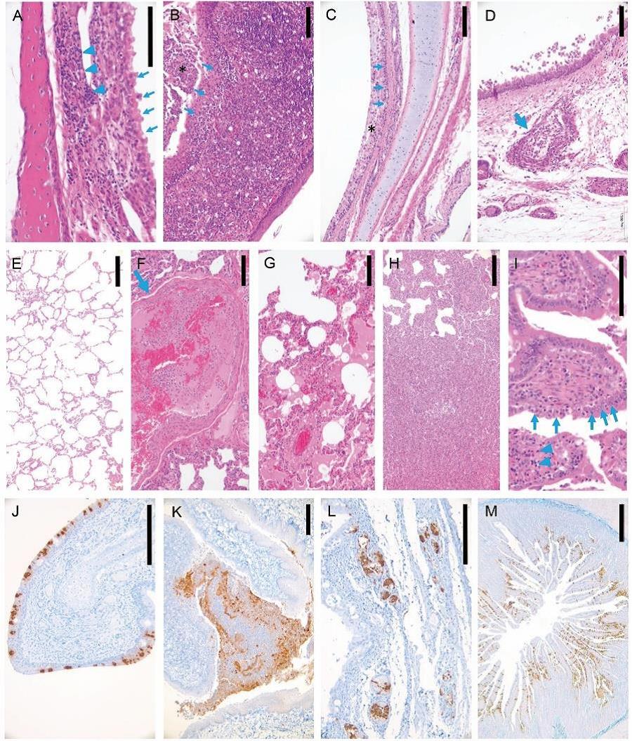 病毒感染后3天病死或安樂死貓組織病理學(xué)及免疫組化研究。(A)鼻粘膜上皮排列紊亂,纖毛脫落 (箭頭), 固有層淋巴細(xì)胞侵潤(箭頭)。(B) 扁桃體上皮細(xì)胞變性、壞死,粘膜上皮(星號)表面覆蓋細(xì)胞碎片及中性粒細(xì)胞(箭)。(C)氣管粘膜上皮變性、壞死(箭),表面覆蓋混有大量細(xì)胞碎片的黏液(星號)。(D)氣管黏液腺上皮壞死,淋巴細(xì)胞侵潤(箭)。(E)未感染病毒貓肺正常組織結(jié)構(gòu)。(F)肺血管內(nèi)炎癥細(xì)胞聚集,纖維蛋白凝結(jié)形成(箭)。(G)肺泡內(nèi)即肺泡間隔大量巨噬細(xì)胞及淋巴細(xì)胞侵潤。(H)肺泡及肺泡間隔炎性侵潤和增生。(I)小腸上皮部分細(xì)胞變性、壞死,固有層中等程度淋巴細(xì)胞侵潤(箭)。 (J)鼻甲粘膜上皮細(xì)胞大量病毒抗原陽性(棕色)。(K)扁桃體粘膜上皮及粘膜表面脫落細(xì)胞大量病毒抗原陽性(棕色)。(L)氣管黏液腺漿液細(xì)胞大量病毒抗原陽性(棕色)。(M)小腸粘膜上皮細(xì)胞大量病毒抗原陽性(棕色)。標(biāo)尺線 A, I = 100 μm, B-H, J-L = 200 μm, M = 500 μm.