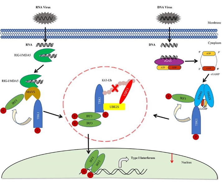 本研究通過(guò)篩選發(fā)現(xiàn)泛素結(jié)合酶UBE2S是天然免疫信號(hào)通路的重要負(fù)調(diào)控因子。UBE2S能夠抑制DNA病毒和RNA病毒感染介導(dǎo)的I型干擾素的產(chǎn)生。深入研究發(fā)現(xiàn)UBE2S通過(guò)招募去泛素化酶USP15抑制干擾素信號(hào)通路中的關(guān)鍵激酶TBK1的K63泛素化,從而抑制TBK1對(duì)下游轉(zhuǎn)錄因子IRF3的磷酸化激活,最終抑制I型干擾素的產(chǎn)生。本研究豐富了泛素化修飾參與I型干擾素產(chǎn)生的調(diào)控網(wǎng)絡(luò),對(duì)于理解機(jī)體抗病毒天然免疫的過(guò)程具有重要意義。