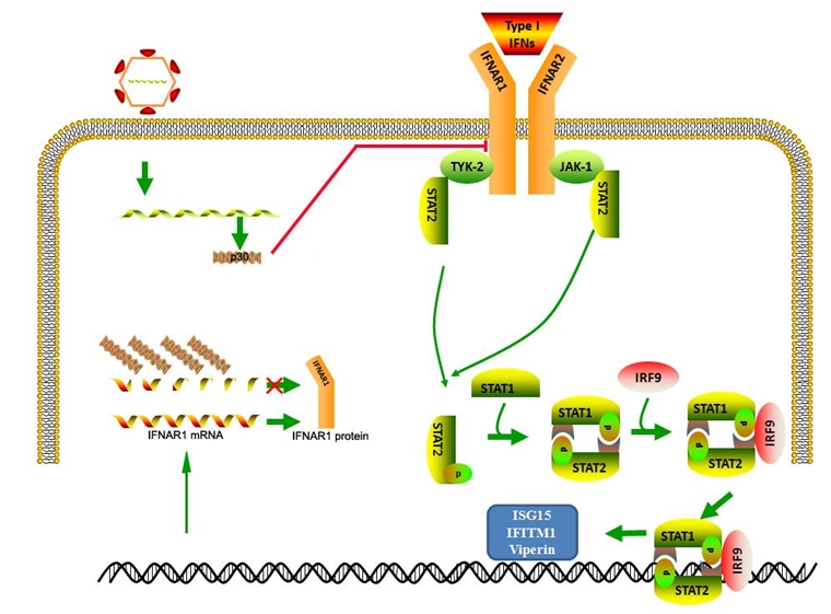 圖1 FCV p30降解IFNAR1 mRNA抑制I型干擾素應(yīng)答機(jī)制模式圖