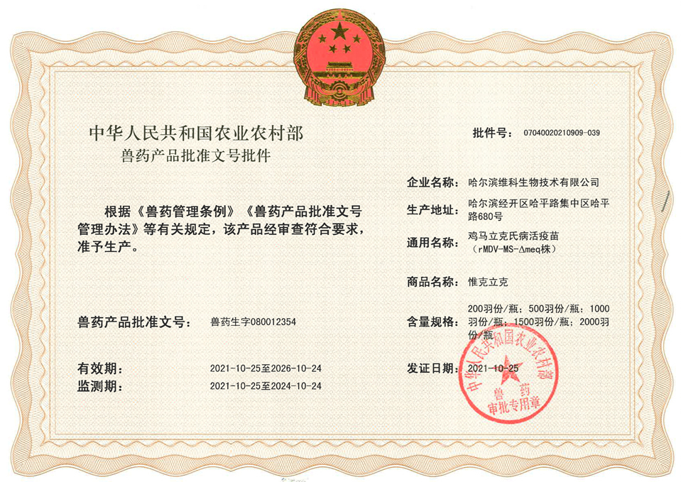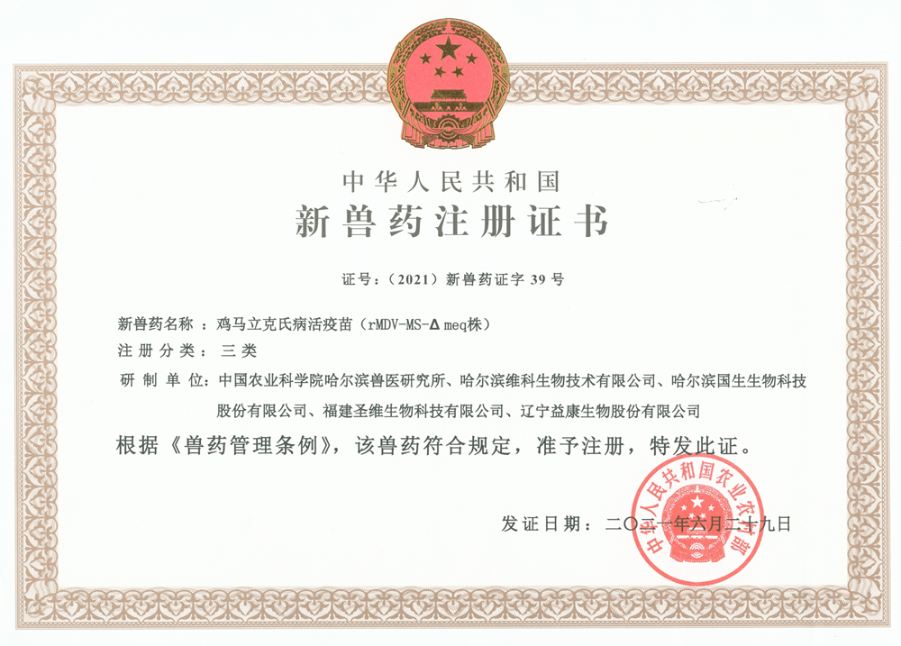 2021年6月30日農(nóng)業(yè)農(nóng)村部發(fā)布第441號公告,由中國農(nóng)業(yè)科學(xué)院哈爾濱獸醫(yī)研究所禽免疫抑制病創(chuàng)新團(tuán)隊(duì)劉長軍研究員主持研制的“雞馬立克氏病活疫苗(rMDV-MS-△meq株)”,獲得國家新獸藥注冊證書[(2021)新獸藥證字39號]。