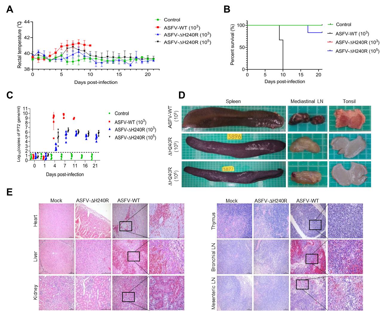 炎癥反應(yīng)是宿主重要的抗病毒免疫反應(yīng),細(xì)胞分泌炎性細(xì)胞因子受到兩個(gè)信號(hào)的調(diào)控,一個(gè)是NF-κB信號(hào)通路的激活,一個(gè)是炎癥小體的活化。我們先前研究發(fā)現(xiàn)NLRP3介導(dǎo)的炎癥反應(yīng)在調(diào)控ASFV致病力中起重要作用,MGF505-7R基因通過抑制NLRP3炎癥反應(yīng)影響ASFV致病力(PMID: 34310655)。本研究利用炎癥小體活化報(bào)告基因?qū)SFV全基因組系統(tǒng)篩選發(fā)現(xiàn),H240R蛋白顯著抑制IL-1β的產(chǎn)生。深入研究發(fā)現(xiàn),H240R既能夠與NF-κB信號(hào)通路中的重要信號(hào)分子NEMO相互作用抑制IL-1β前體的轉(zhuǎn)錄,又能夠與NLRP3相互作用抑制NLRP3炎癥小體的活化,最終抑制IL-1β的成熟與分泌。缺失 H240R 基因的ASFV(ASFV-ΔH240R)感染豬原代肺泡巨噬細(xì)胞(PAM)和SPF豬均誘導(dǎo)大量炎性細(xì)胞因子的產(chǎn)生。動(dòng)物實(shí)驗(yàn)結(jié)果表明,103 HAD50 ASFV-ΔH240R 感染SPF豬全部存活,105 HAD50 ASFV-ΔH240R 感染組僅一頭豬(1/5)死亡。該研究表明,H240R基因是ASFV的關(guān)鍵毒力基因,其通過抑制炎癥反應(yīng)影響ASFV致病力。