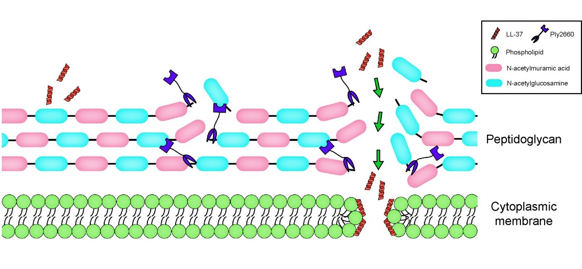 本研究發(fā)現(xiàn)了噬菌體裂解酶Ply2660具有抗VREF的效果。體外研究發(fā)現(xiàn),低劑量的裂解酶Ply2660能與抗菌肽LL-37產(chǎn)生協(xié)同抗菌活性,快速殺滅VREF和多重耐藥糞腸球菌。進一步分析發(fā)現(xiàn),Ply2660與LL-37協(xié)同抗菌的高效性是由于Ply2660降解VREF細胞壁肽聚糖,使LL-37更易于接近細胞膜而插入脂質(zhì)雙分子層,進而增強了裂解細菌效應。此外,低劑量Ply2660與LL-37的組合在對抗VREF生物被膜方面表現(xiàn)出顯著優(yōu)勢。小鼠腹腔敗血癥感染模型試驗進一步證明,Ply2660與LL-37的聯(lián)合應用,相比于其單一藥物,可以有效治療VREF感染。該研究開發(fā)了一種對抗VREF感染的無抗生素替代治療策略,并為治療其它超級細菌感染提供了新的思路。
