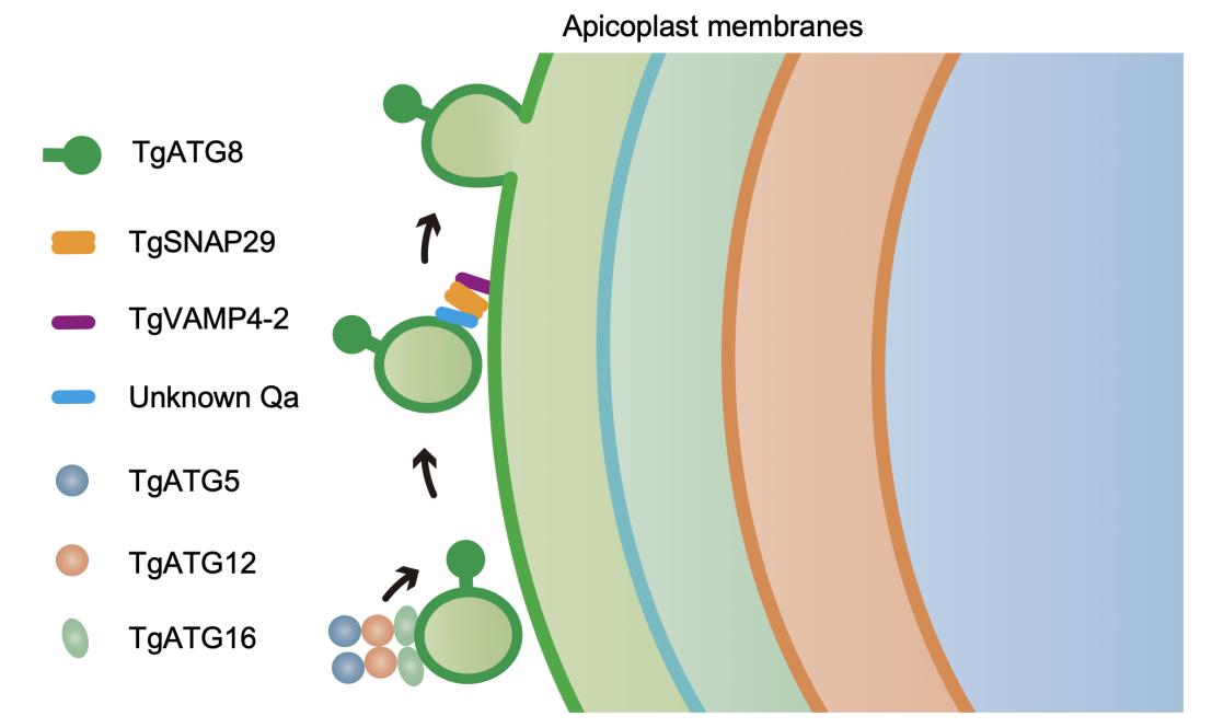 該研究發(fā)現(xiàn)了ATG12–ATG5-ATG16L復(fù)合物存在于弓形蟲(chóng)中,具有促進(jìn)TgATG8的脂化活性。TgATG8定位于頂質(zhì)體的過(guò)程依賴于TgSNAP29/TgVAMP4-2 SNARE復(fù)合物介導(dǎo)的囊泡融合。TgATG8保守的UDS位點(diǎn)對(duì)于其在頂質(zhì)體上正確定位也至關(guān)重要。這些研究結(jié)果說(shuō)明,弓形蟲(chóng)的自噬系統(tǒng)極可能參與了頂質(zhì)體的靶向轉(zhuǎn)運(yùn)過(guò)程。另一方面,弓形蟲(chóng)自噬相關(guān)蛋白對(duì)于蟲(chóng)體持續(xù)感染也至關(guān)重要。因此,本研究也對(duì)弓形蟲(chóng)弱毒疫苗的研發(fā)具有指導(dǎo)意義。