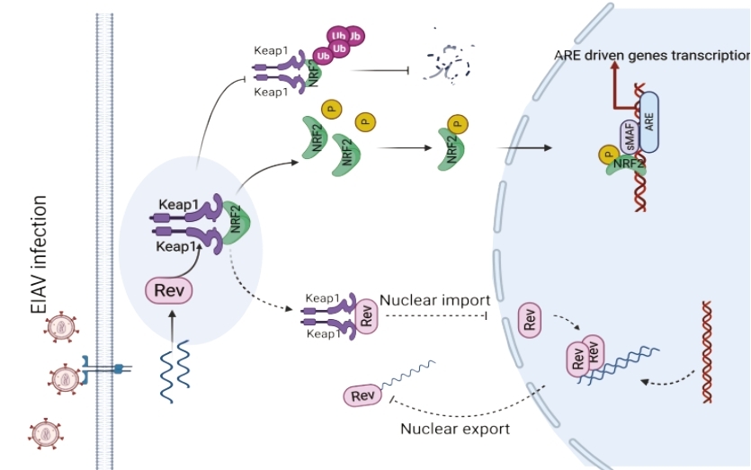 Keap1-Nrf2通路是宿主防御氧化損傷的核心機(jī)制,參與多種病原感染的復(fù)制調(diào)控。該團(tuán)隊(duì)研究揭示,Keap1在馬傳貧病毒感染后,可以識(shí)別早期蛋白R(shí)ev并與之有效結(jié)合,從而競(jìng)爭(zhēng)性抑制了Keap1和Nrf2的結(jié)合。削弱了Keap1泛素化Nrf2的能力,提高了游離Nrf2的磷酸化水平,進(jìn)而促進(jìn)其進(jìn)入細(xì)胞核的能力。隨后Nrf2與其下游效應(yīng)器ARE結(jié)合,完成Keap1-Nrf2通路對(duì)馬傳貧病毒感染的響應(yīng)過(guò)程。進(jìn)一步研究發(fā)現(xiàn),激活的Keap1-Nrf2通路一方面可以通過(guò)促進(jìn)多種抗氧化物酶的表達(dá),調(diào)控宿主的氧化還原穩(wěn)態(tài)間接的發(fā)揮抗病毒作用。另一方面,由于Keap1和Rev的結(jié)合,影響了Rev轉(zhuǎn)運(yùn)病毒mRNA的能力,干擾了病毒相關(guān)編碼蛋白的轉(zhuǎn)錄水平,從而對(duì)馬傳貧病毒的復(fù)制產(chǎn)生直接的抑制作用。本研究首次揭示了Keap1-Nrf2不完全依賴于抗氧化物酶調(diào)控病毒復(fù)制的新的作用模式,豐富了宿主針對(duì)慢病毒感染的防御機(jī)制,也可為靶向 Keap1-Nrf2通路研發(fā)抗病毒藥物提供新的靶標(biāo)。