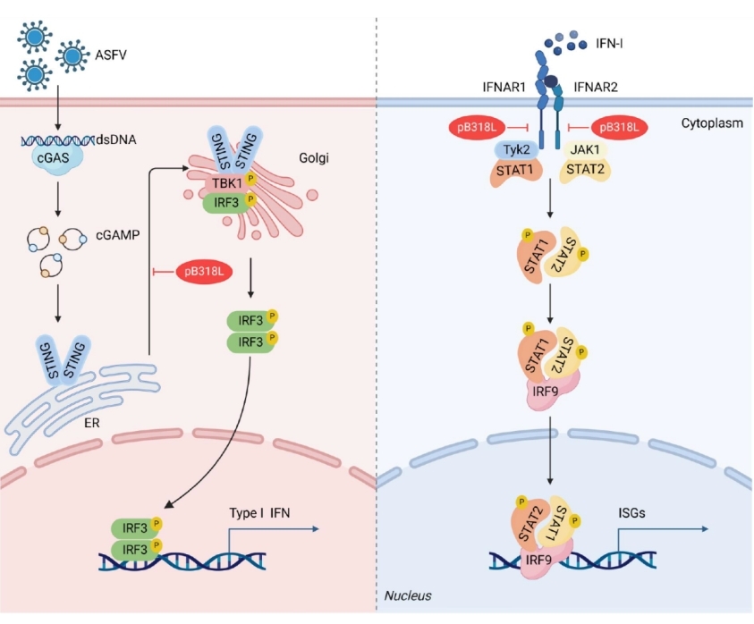 pB318L蛋白在ASFV復(fù)制和免疫調(diào)控中的作用未知。研究發(fā)現(xiàn),與其親本病毒ASFV HLJ/18比較, B318L基因突變的ASFV重組毒株(ASFV-intB318L)感染豬肺泡巨噬細(xì)胞產(chǎn)生更多的I型干擾素和干擾素刺激基因。進(jìn)一步探究發(fā)現(xiàn),pB318L與cGAS-STING信號通路中的STING相互作用抑制了STING從內(nèi)質(zhì)網(wǎng)向高爾基體的易位,從而抑制I型干擾素的產(chǎn)生。同時(shí)pB318L還與JAK-STAT信號通路中的干擾素受體結(jié)合,抑制干擾素刺激基因的產(chǎn)生。本研究為設(shè)計(jì)抗ASFV藥物或減毒活疫苗提供了線索。