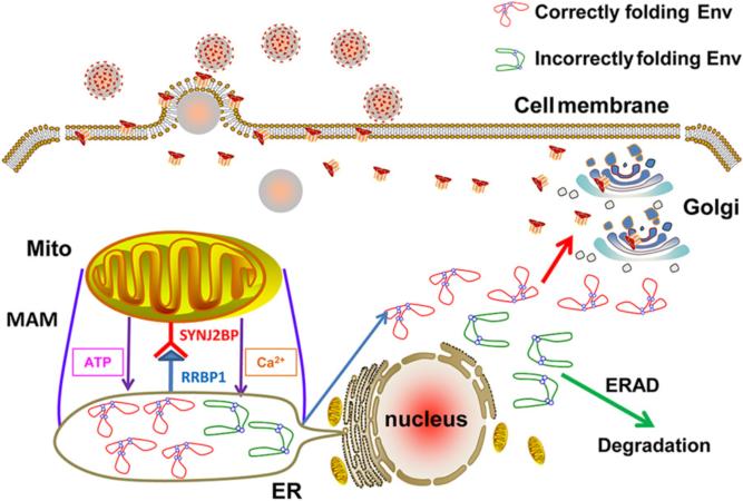 該研究發(fā)現(xiàn)EIAV感染宿主細胞后,SYNJ2BP的表達量上調(diào)。為了驗證SYNJ2BP在病毒復(fù)制中的關(guān)鍵作用,構(gòu)建了SYNJ2BP缺失的細胞系,實驗表明SYNJ2BP可提高EIAV病毒的感染效率。進一步研究發(fā)現(xiàn),SYNJ2BP可促進MAM的形成,進而提高EIAV或HIV的Env生成,但是對于其他病毒蛋白,如結(jié)構(gòu)蛋白Gag或非結(jié)構(gòu)蛋白Rev的生成均沒有作用。ATP和鈣離子對于內(nèi)質(zhì)網(wǎng)中氧化蛋白折疊至關(guān)重要,進一步的研究表明,SYNJ2BP通過促進MAM的形成,提高Env過表達細胞內(nèi)質(zhì)網(wǎng)中的ATP和鈣離子濃度,增加了Env的生成。除此之外,該研究首次發(fā)現(xiàn)EIAV的Env與HIV的Env相似,錯誤折疊后被ERAD調(diào)控并降解,當(dāng)SYNJ2BP促進MAM形成后,提高了EIAV和HIV的Env在內(nèi)質(zhì)網(wǎng)中的正確折疊率,避免激活更多的內(nèi)質(zhì)網(wǎng)應(yīng)激反應(yīng)和ERAD降解。