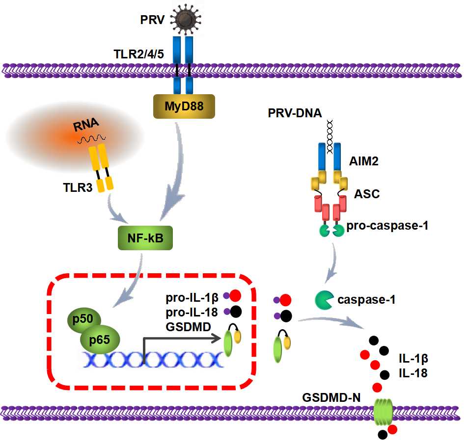 炎癥反應(yīng)是宿主重要的抗病毒免疫反應(yīng)之一,抗病毒炎性因子的轉(zhuǎn)錄、成熟和分泌受到三個(gè)信號(hào)的調(diào)控。研究發(fā)現(xiàn)PRV感染小鼠腹腔巨噬細(xì)胞后通過激活多個(gè)Toll樣受體,促使NF-κB入核,促進(jìn)白細(xì)胞介素等炎性因子的轉(zhuǎn)錄與表達(dá)。通過構(gòu)建多種基因敲除小鼠感染模型,發(fā)現(xiàn)PRV感染可激活A(yù)IM2炎癥小體,從而促使IL-1β和IL-18的成熟。進(jìn)一步研究發(fā)現(xiàn),PRV感染還可以誘導(dǎo)GSDMD的上調(diào)表達(dá),活化的GSDMD促進(jìn)炎性因子分泌到細(xì)胞外。因此,本研究揭示了在PRV感染后會(huì)激活以上三個(gè)信號(hào)來誘導(dǎo)具有生物活性的炎癥因子的分泌,從而抑制PRV增殖的分子機(jī)制,在宿主抵抗PRV感染過程中發(fā)揮了重要作用。