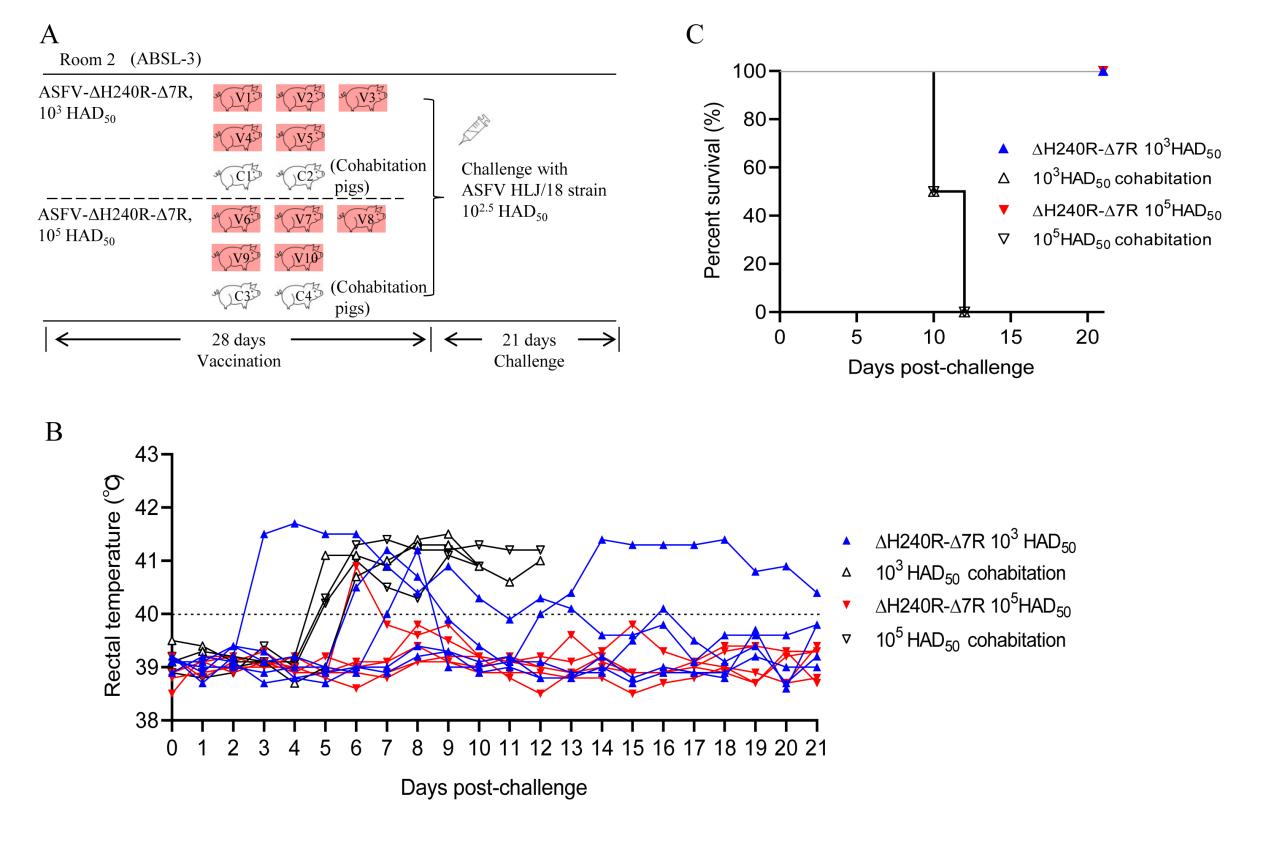 非洲豬瘟是由非洲豬瘟病毒引起的一種急性、高致死性傳染病,給世界養(yǎng)豬業(yè)造成了嚴重的經(jīng)濟損失。由于病毒的致病機制不清楚,而且缺乏安全、高效的疫苗和特效藥物,非洲豬瘟的防控形勢依然嚴峻。哈獸研相關(guān)團隊在前期鑒定好的兩個與非洲豬瘟病毒致病力密切相關(guān)的基因MGF505-7R(PLoS Pathog,2021)和H240R(J Virol,2023)基礎(chǔ)上,本研究以非洲豬瘟病毒HLJ/18為親本株,同時敲除H240R和MGF505-7R基因,獲得一個雙基因缺失毒株(ASFV-ΔH240R-Δ7R)。