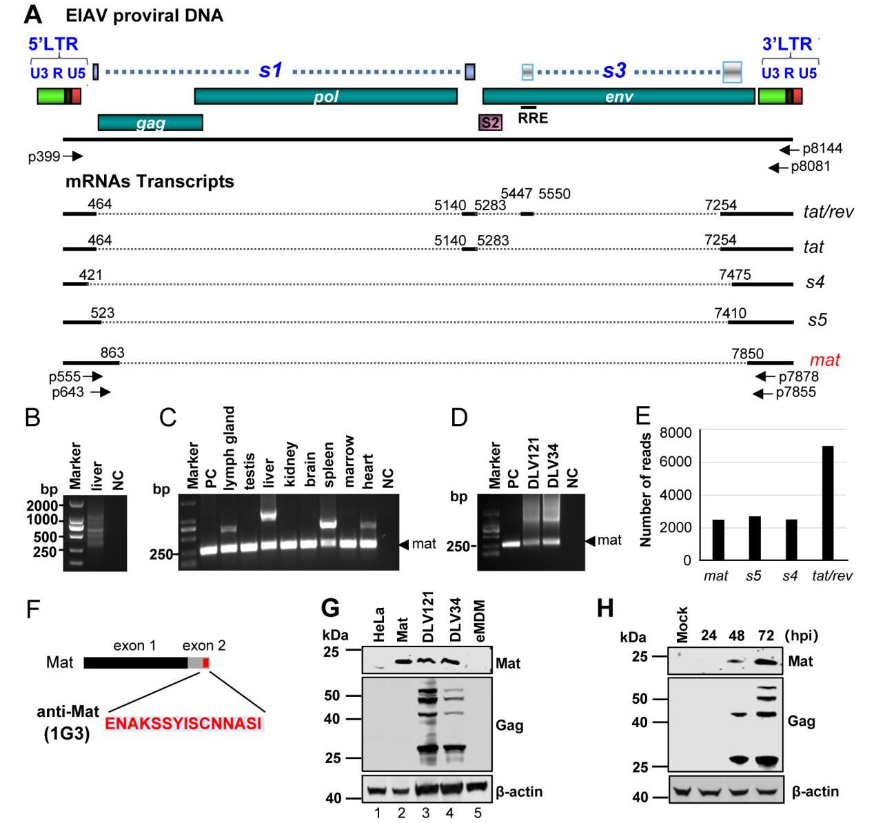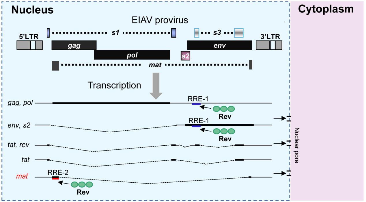 馬傳染性貧血病毒(EIAV)與人免疫缺陷病毒(HIV-1)同屬于逆轉(zhuǎn)錄病毒科慢病毒屬的成員。慢病毒是一類基因組結(jié)構(gòu)較為復(fù)雜的反轉(zhuǎn)錄病毒,其基因組除了編碼反轉(zhuǎn)錄病毒共有的3個結(jié)構(gòu)蛋白(Gag、Pol和Env)外,還編碼3-6個不等的附屬蛋白。前期研究認為,EIAV是基因組結(jié)構(gòu)最簡單的慢病毒,只編碼3種附屬蛋白(Tat、S2和Rev),而HIV-1編碼6種附屬蛋白(Tat、Rev、Nef、Vpu、Vif、Vpr)。該研究從EIAV感染馬的組織中擴增到多種新的mRNA轉(zhuǎn)錄本,并證明了其中一種單剪接轉(zhuǎn)錄本可以編碼新的病毒蛋白Mat。