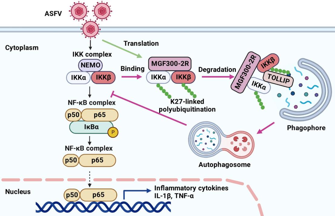 為探究調(diào)控ASFV在PAMs中復(fù)制的關(guān)鍵MGFs,本研究創(chuàng)新性地采用MGFs大片段與單個(gè)基因缺失相結(jié)合的策略,成功鑒定出MGF300家族基因(1L、2R和4L)為ASFV在PAMs中復(fù)制降低的關(guān)鍵基因。其中MGF300-2R基因編碼蛋白可定位于細(xì)胞質(zhì)和細(xì)胞核,推測其在ASFV的感染中發(fā)揮重要作用。為探究MGF300-2R蛋白調(diào)控ASFV復(fù)制的分子機(jī)制,本研究通過轉(zhuǎn)錄組測序分析發(fā)現(xiàn),相比野生型ASFV(ASFV-WT),MGF300-2R基因缺失毒株(Del2R)感染PAMs后,可誘導(dǎo)高水平炎性細(xì)胞因子IL-1β和TNF-α的產(chǎn)生。機(jī)制研究表明,MGF300-2R蛋白與NF-κB信號(hào)通路中的關(guān)鍵分子IKKα和IKKβ存在相互作用,并可促進(jìn)其發(fā)生K27連接的多聚泛素化,進(jìn)而招募選擇性自噬受體TOLLIP,通過自噬溶酶體途徑降解IKKα和IKKβ,從而抑制IL-1β和TNF-α的產(chǎn)生。體內(nèi)感染試驗(yàn)發(fā)現(xiàn),接種102 TCID50的Del2R對(duì)豬只無致病性,當(dāng)接種103 TCID50的Del2R時(shí),豬只的存活率為50%,具有一定致病性。進(jìn)一步的研究發(fā)現(xiàn),相比ASFV-WT,Del2R在豬只體內(nèi)的復(fù)制顯著降低并可以誘導(dǎo)高水平IL-1β和TNF-α的產(chǎn)生,同時(shí)也可以激發(fā)良好的體液免疫應(yīng)答。本研究不僅證實(shí)MGF300-2R蛋白為ASFV的毒力相關(guān)因子,也為ASF減毒活疫苗的科學(xué)設(shè)計(jì)提供了新的靶標(biāo)。