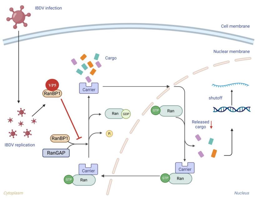 本研究發(fā)現(xiàn),IBDV感染會觸發(fā)宿主shutoff。進(jìn)而證明,VP5蛋白是IBDV觸發(fā)shutoff的關(guān)鍵蛋白?;隗w內(nèi)外感染模型的數(shù)據(jù)顯示,IBDV可利用VP5抑制宿主細(xì)胞的基因轉(zhuǎn)錄,并利于病毒自身感染。進(jìn)一步研究發(fā)現(xiàn),VP5可與宿主RanBP1競爭性結(jié)合,破壞Ran蛋白循環(huán),進(jìn)而干擾細(xì)胞核質(zhì)轉(zhuǎn)運(yùn),損害攜帶核定位信號蛋白質(zhì)的核輸入,最終導(dǎo)致宿主基因轉(zhuǎn)錄的抑制;其中p65和IRF7等關(guān)鍵轉(zhuǎn)錄調(diào)控因子的核轉(zhuǎn)運(yùn)也受到干擾,導(dǎo)致促炎細(xì)胞因子和干擾素的表達(dá)受到抑制。本研究揭示了IBDV通過VP5以轉(zhuǎn)錄依賴的方式觸發(fā)宿主shutoff的分子機(jī)制,也為認(rèn)知病毒如何逃逸和抑制宿主天然免疫并建立感染提供了新見解。