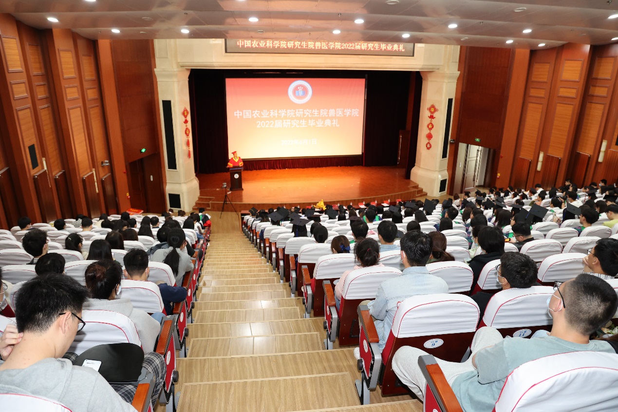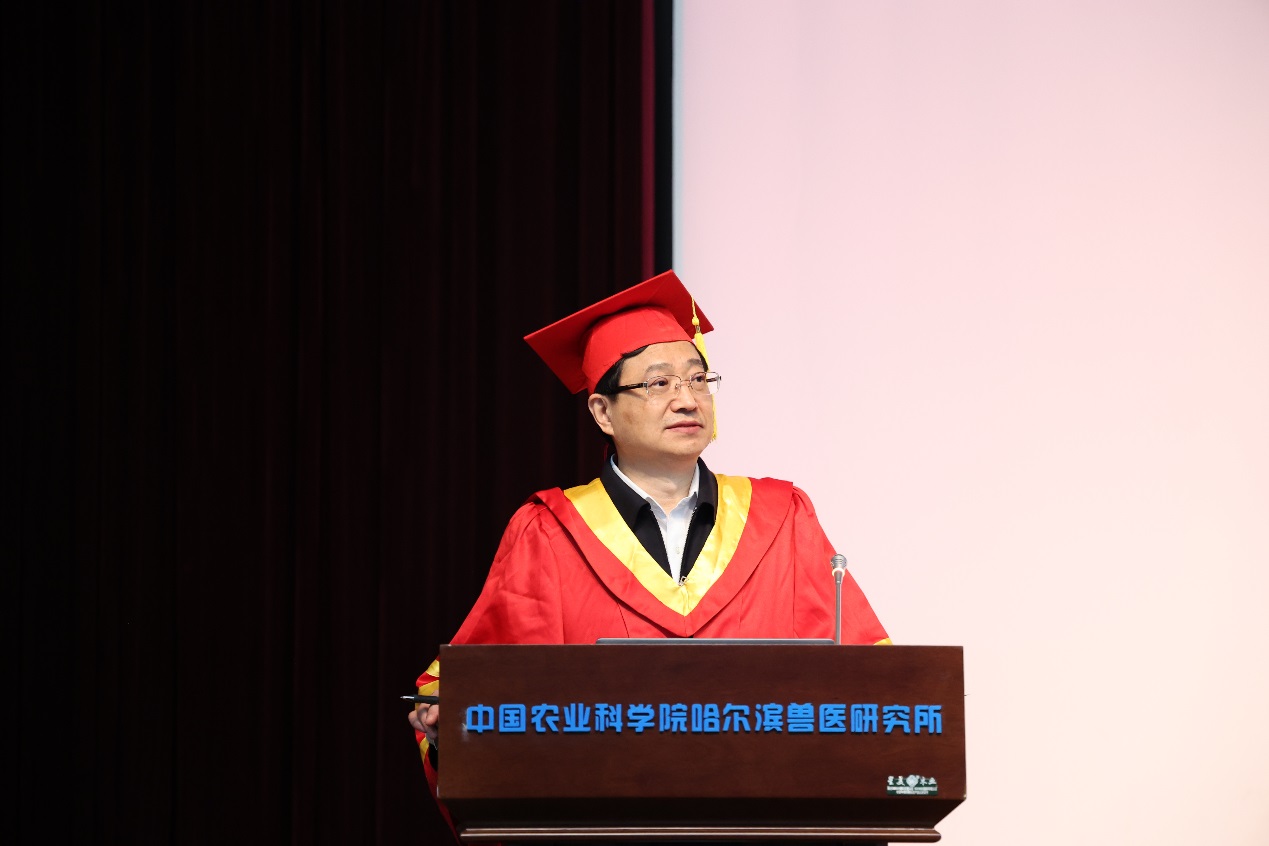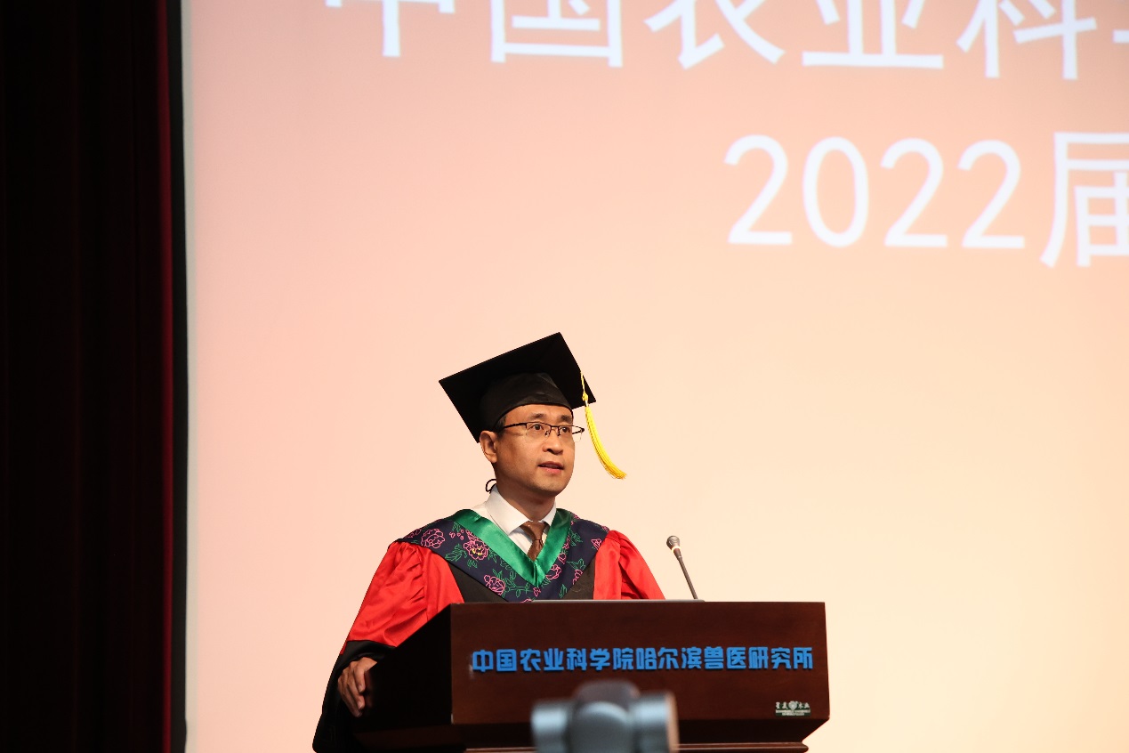 6月1日,中國農(nóng)科院研究生院獸醫(yī)學(xué)院2022屆研究生畢業(yè)典禮在哈爾濱獸醫(yī)研究所綜合樓召開。中國農(nóng)科院研究生院賈廣東書記、王述民副院長線上出席,中國農(nóng)科院哈爾濱獸醫(yī)研究所陳化蘭院士,獸醫(yī)學(xué)院院長、哈獸研步志高所長,王笑梅書記,劉勝旺副所長,馮力副所長,孫百明副所長,黨委委員張曉鵬主任,肇慶大華農(nóng)生物藥品有限公司陳瑞愛董事長,北京金諾百泰生物技術(shù)公司李剛董事長,北大荒牧業(yè)有限責(zé)任公司劉佳明總經(jīng)理、金勝柱副總經(jīng)理以及研究所職能部門負(fù)責(zé)人和創(chuàng)新團(tuán)隊(duì)首席、班主任、導(dǎo)師、研究生300余人參加。典禮由獸醫(yī)學(xué)院常務(wù)副院長劉益民主持。