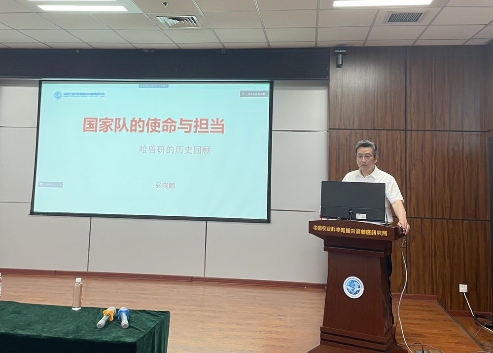 張曉鵬作了“國(guó)家隊(duì)的使命和擔(dān)當(dāng)”的報(bào)告,講述了哈爾濱獸醫(yī)研究所的創(chuàng)立、建設(shè)和發(fā)展不同時(shí)期,以滿足國(guó)家重大需求為己任,勇于承擔(dān)國(guó)家隊(duì)的歷史使命,求是創(chuàng)新、自立自強(qiáng)、擔(dān)當(dāng)奉獻(xiàn)、為國(guó)分憂的歷程。