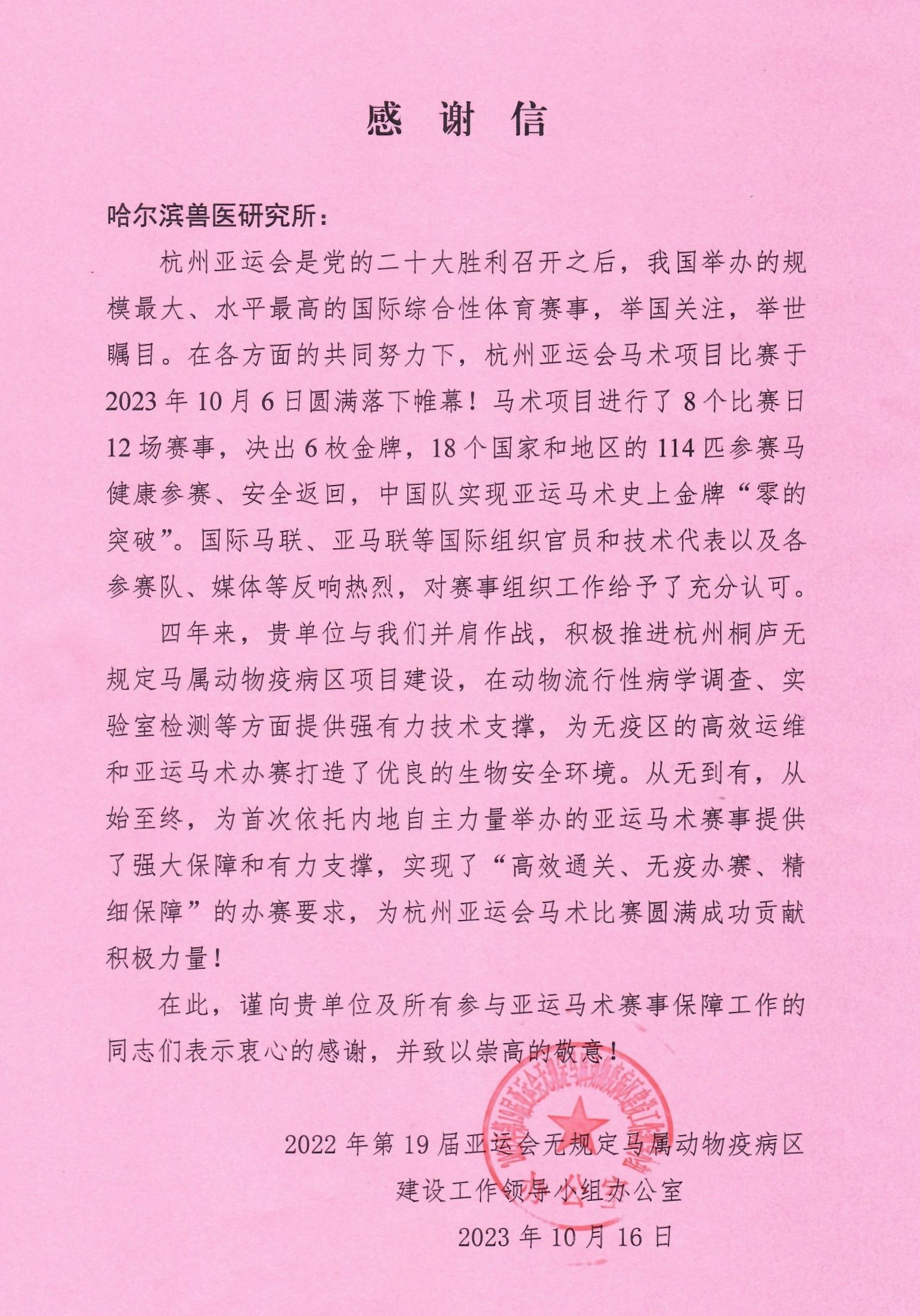 2023年10月16日,2022年第19屆亞運會無規(guī)定馬屬動物疫病區(qū)建設(shè)工作領(lǐng)導(dǎo)小組辦公室向中國農(nóng)業(yè)科學(xué)院哈爾濱獸醫(yī)研究所(哈獸研)發(fā)來感謝信,感謝哈獸研“積極推進杭州桐廬無規(guī)定馬屬動物疫病區(qū)建設(shè),在動物流行病學(xué)調(diào)查、實驗室檢測等方面提供強有力技術(shù)支撐,為無疫區(qū)的高效運維和亞運馬術(shù)比賽打造了優(yōu)良的生物安全環(huán)境”。